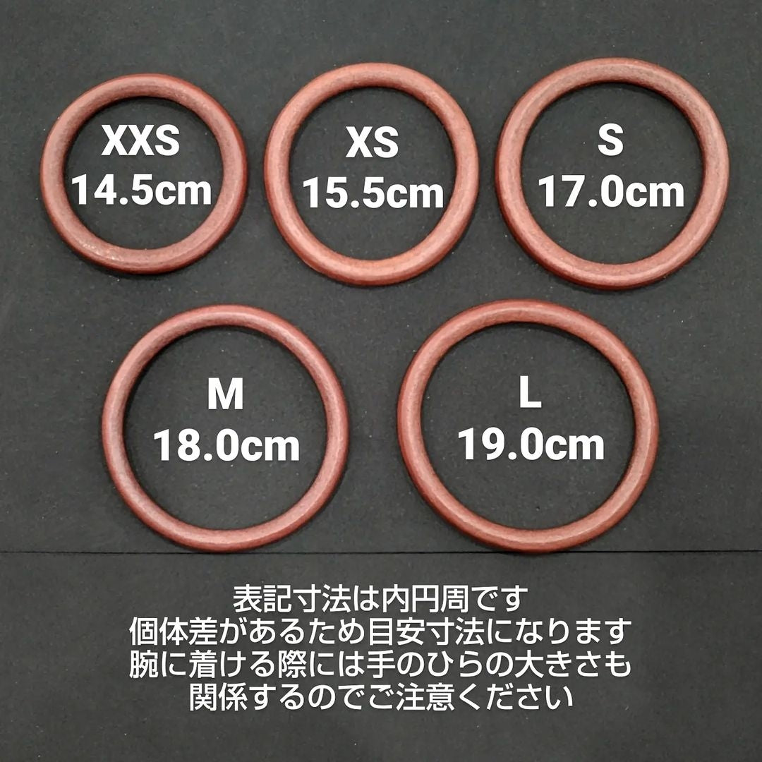 2枚目の画像はブレスの内寸法を実測した平均値を載せていますが、個体差があるためあくまでも目安としてお考えください。